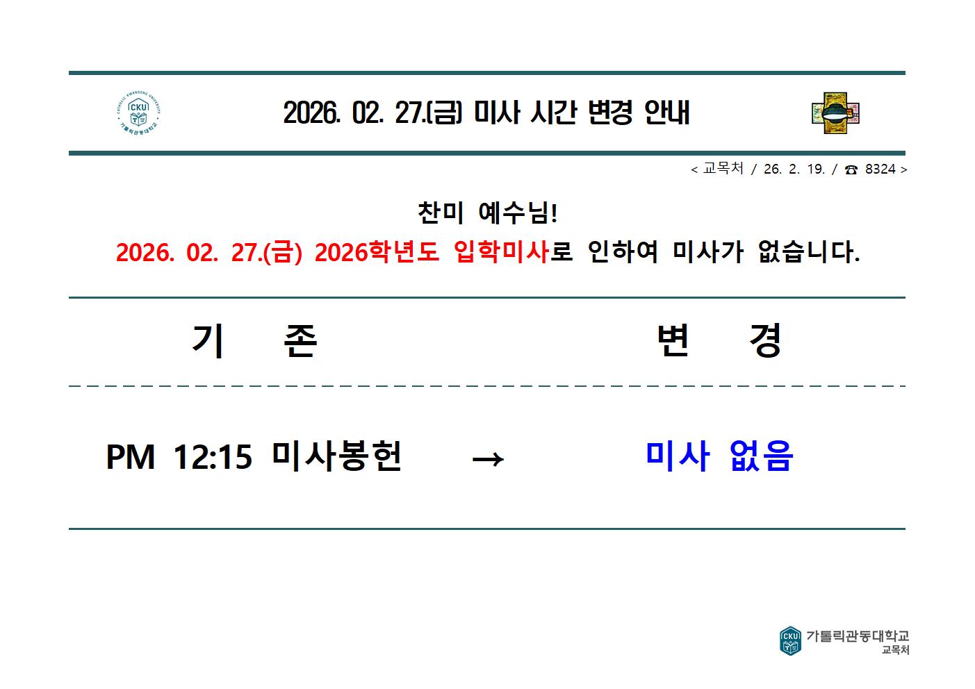 fnctId=bbs,fnctNo=915 글번호 363140 2026. 02.27.(금) 미사 시간 변경 안내 수정일 2026.02.19 작성자 교목팀 조회수 129 등록일 2026.02.19 첨부파일 첨부파일이(가) 없습니다.