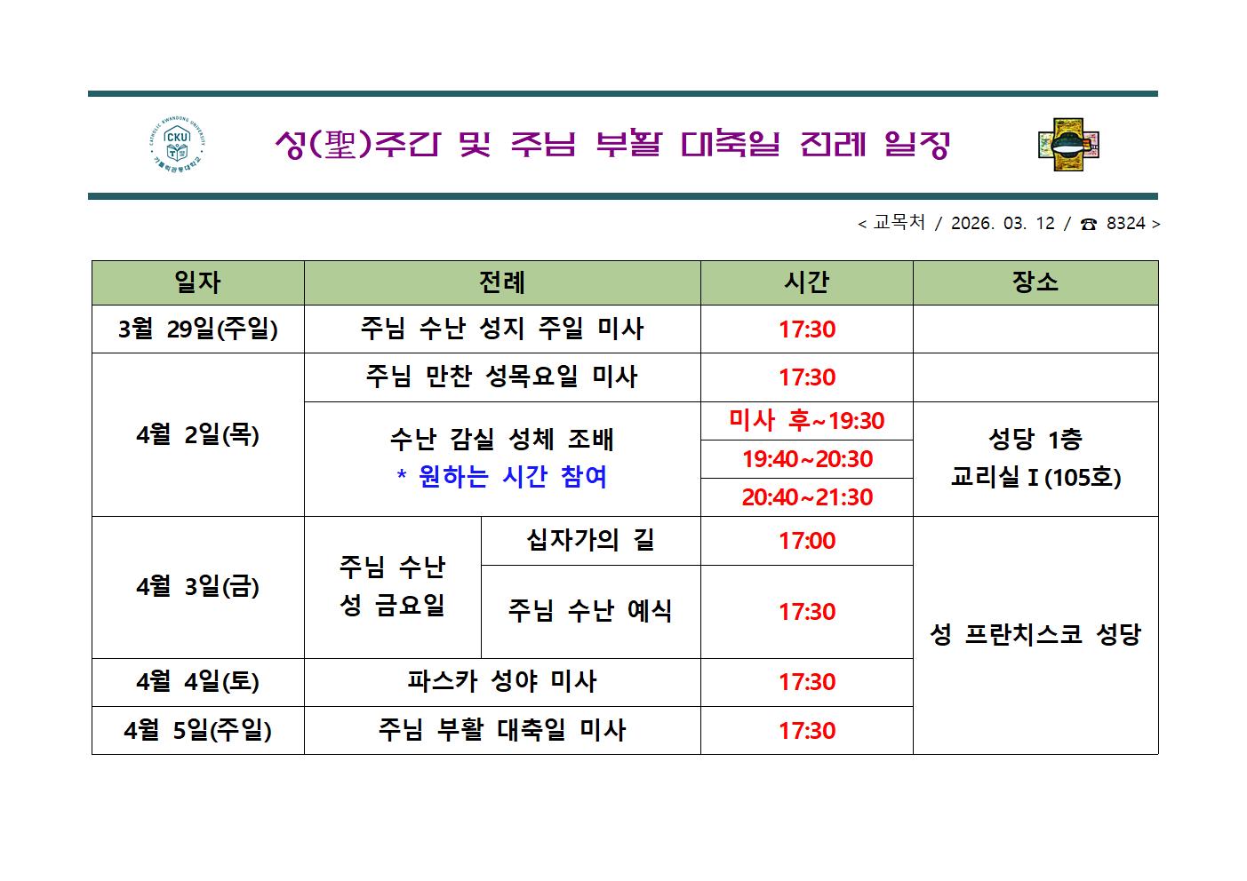 fnctId=bbs,fnctNo=915 글번호 363573 2026. 03. 29.(일) - 04. 05.(일) 주님 수난 성지주일, 성주간 및 주님부활대축일 미사시간 안내 수정일 2026.03.12 작성자 교목팀 조회수 23 등록일 2026.03.12 첨부파일 첨부파일이(가) 없습니다.