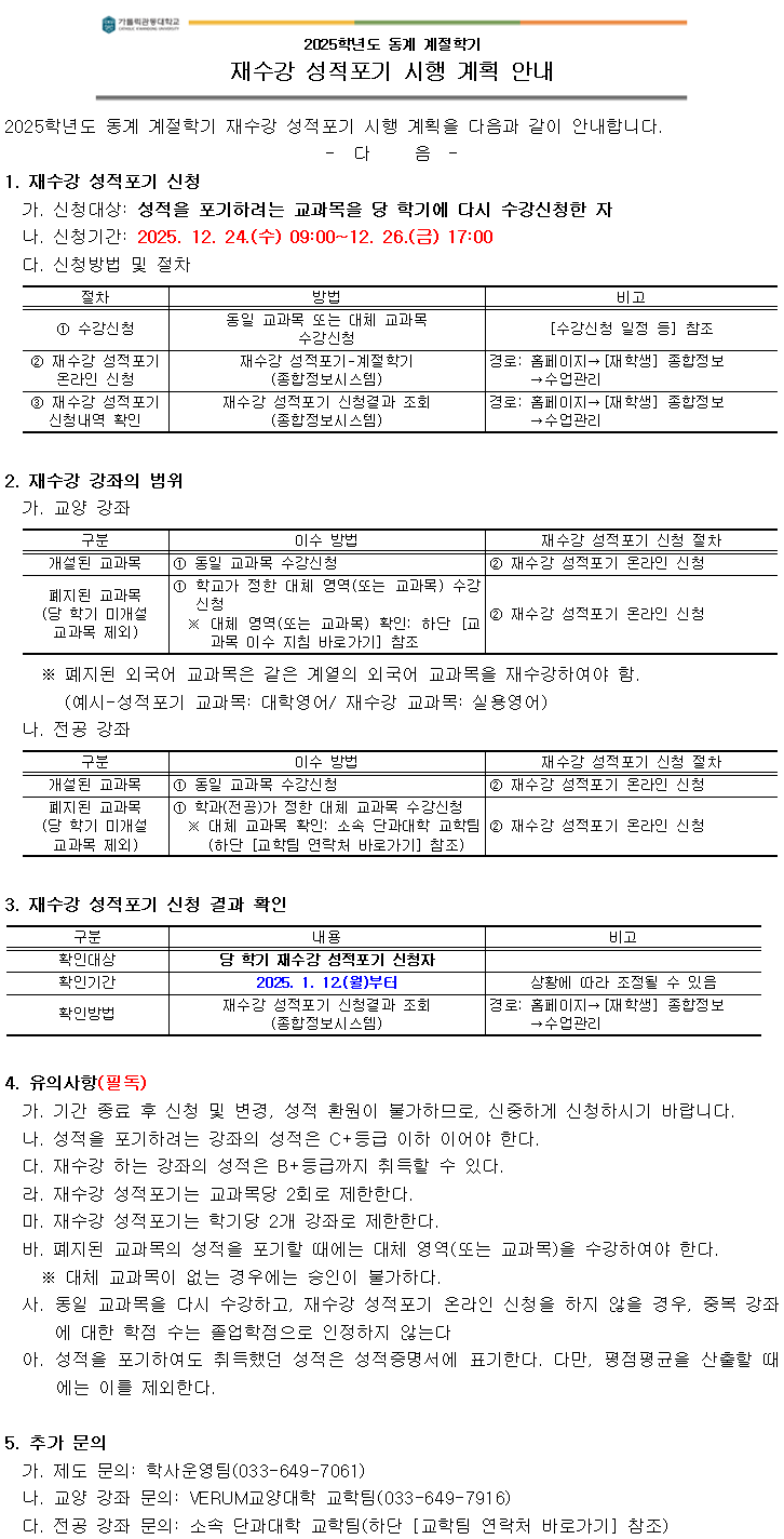 fnctId=bbs,fnctNo=1174 글번호 362171 2025학년도 동계 계절학기 재수강 성적포기 시행 계획 안내 수정일 2025.12.23 작성자 학사운영팀 조회수 103 등록일 2025.12.23 첨부파일 첨부파일이(가) 없습니다.