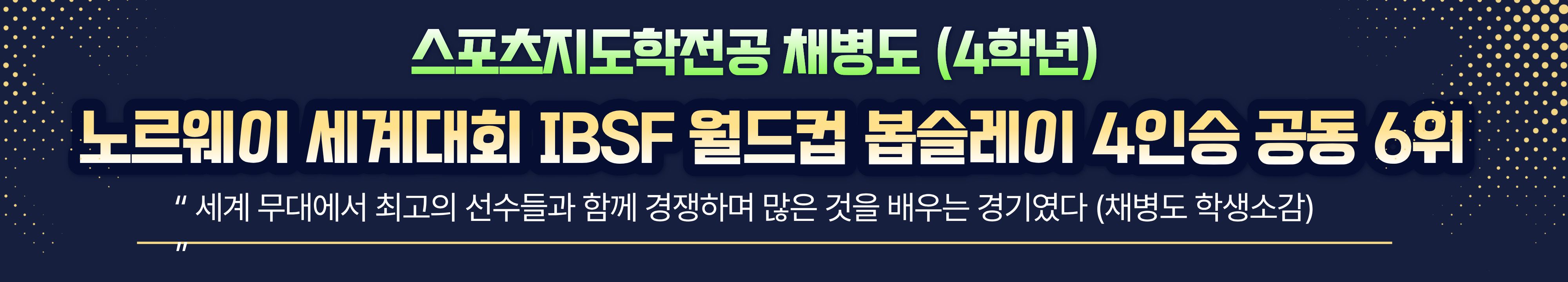 우리 대학 스포츠지도학전공 4학년에 재학 중인 채병도 선수가 포함된 한국 봅슬레이 남자 4인승 대표팀이 2025-2026시즌 국제봅슬레이스켈레톤연맹(IBSF) 월드컵 3차 대회에서 공동 6위에 오르며 세계무대에서 경쟁력을 입증했다.