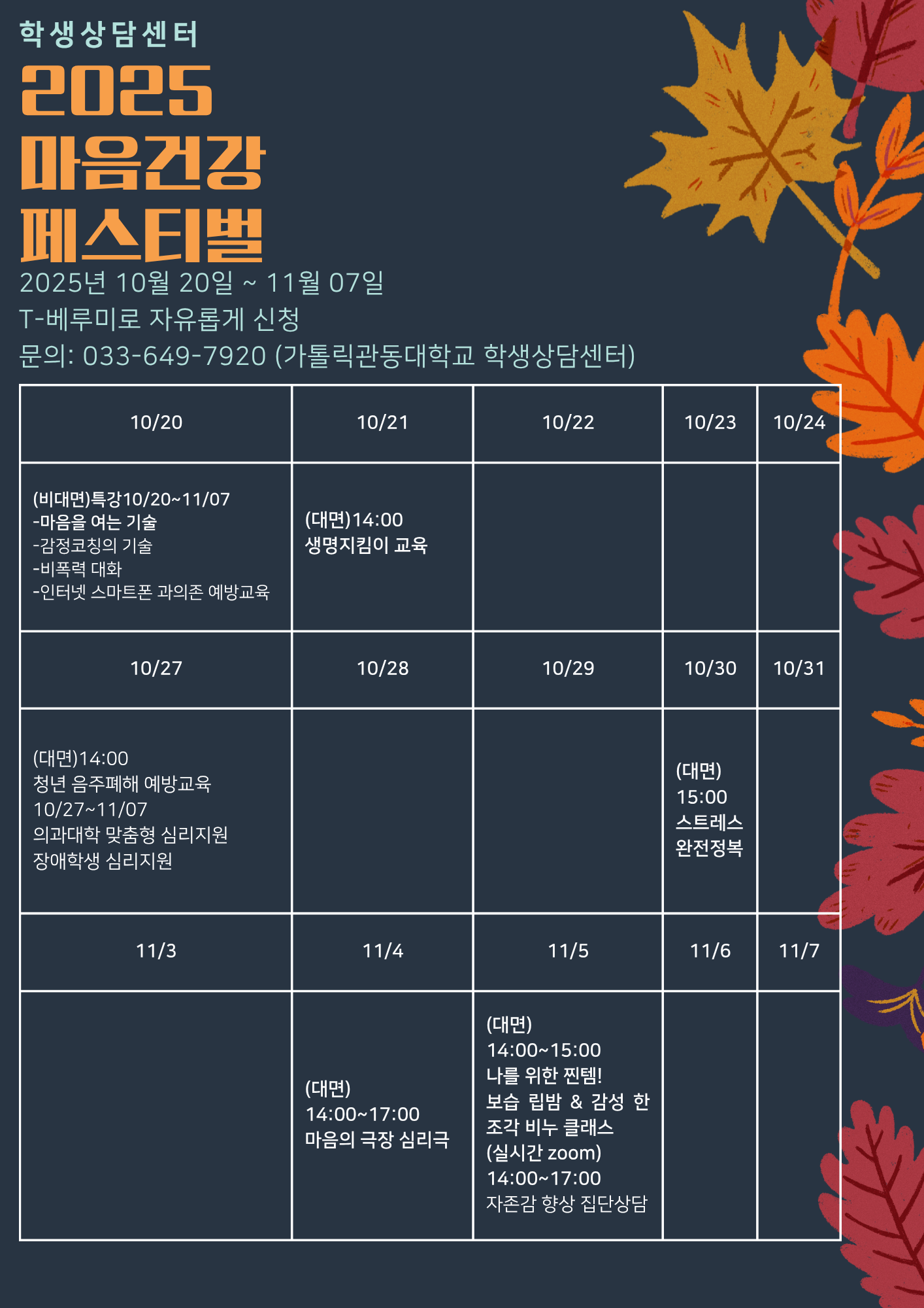 fnctId=bbs,fnctNo=927 글번호 360407 2025학년도 2학기 마음건강 페스티벌 수정일 2025.10.15 작성자 박진용 조회수 23 등록일 2025.10.15 첨부파일 2025-마음건강페스티벌 포스터.png 바로보기