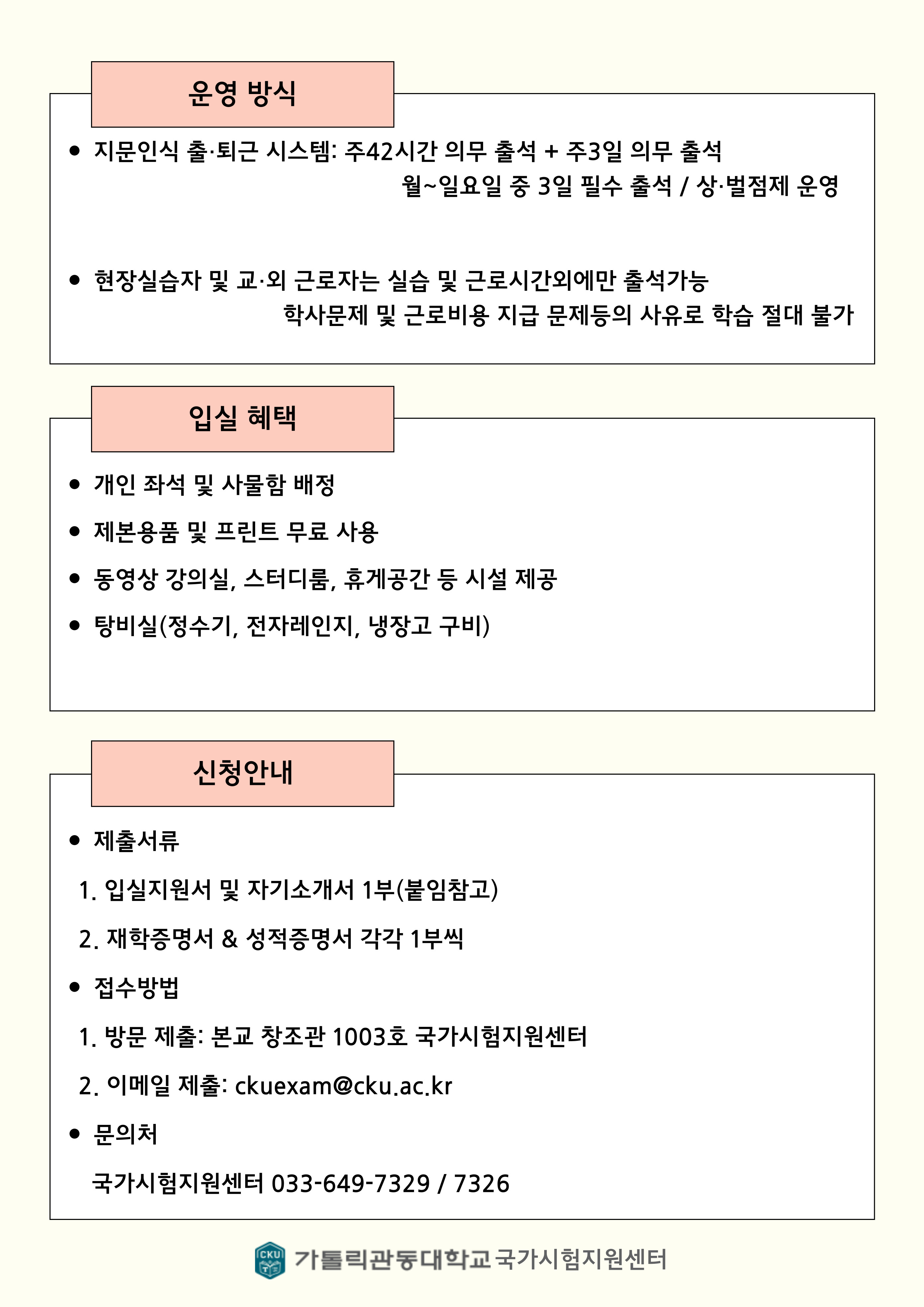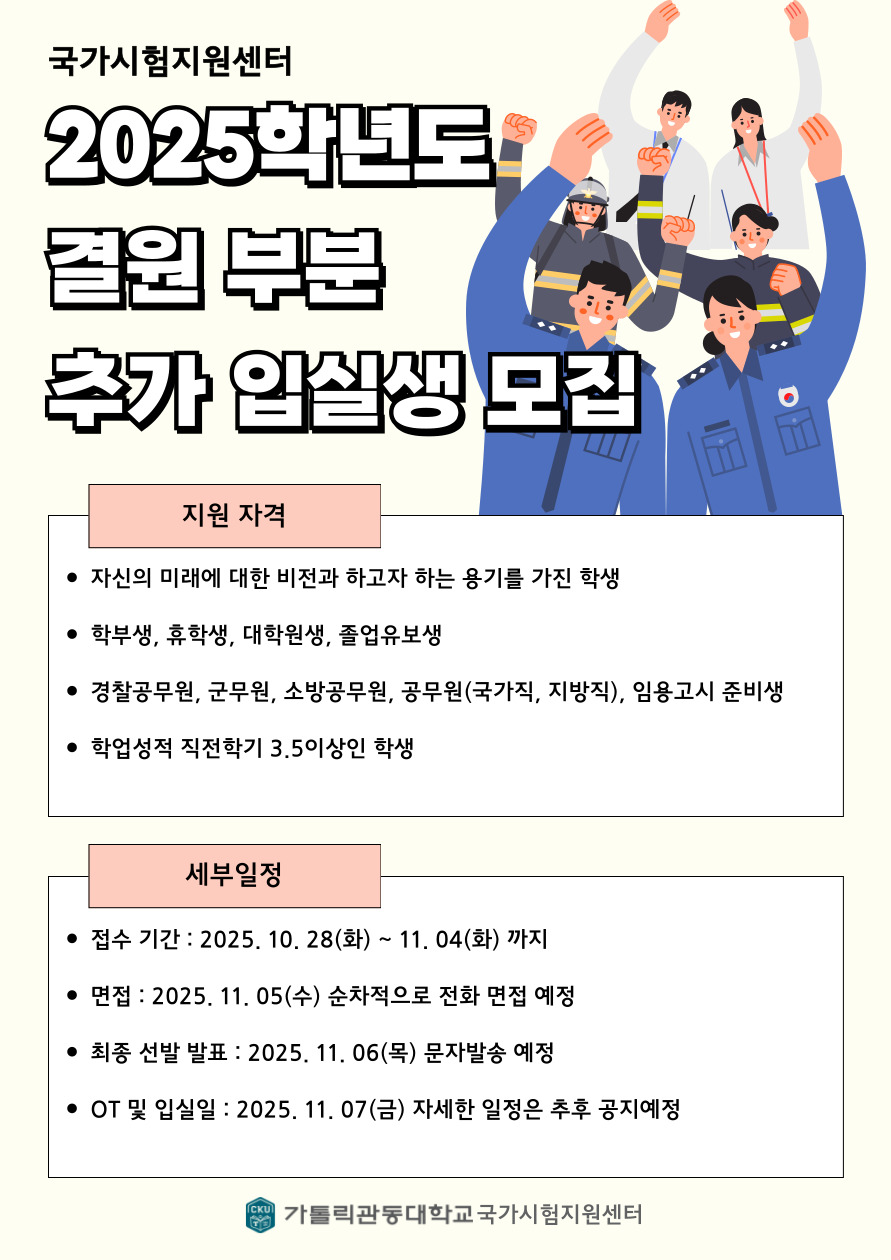 fnctId=bbs,fnctNo=931 글번호 360680 2025학년도 국가시험지원센터 결원 부분 추가 입실생 모집 공고 수정일 2025.10.28 작성자 국가시험지원센터 조회수 45 등록일 2025.10.28 첨부파일 1. 가톨릭관동대학교 국가시험지원센터 입실 지원서 및 자기소개서 양식.hwp 바로보기