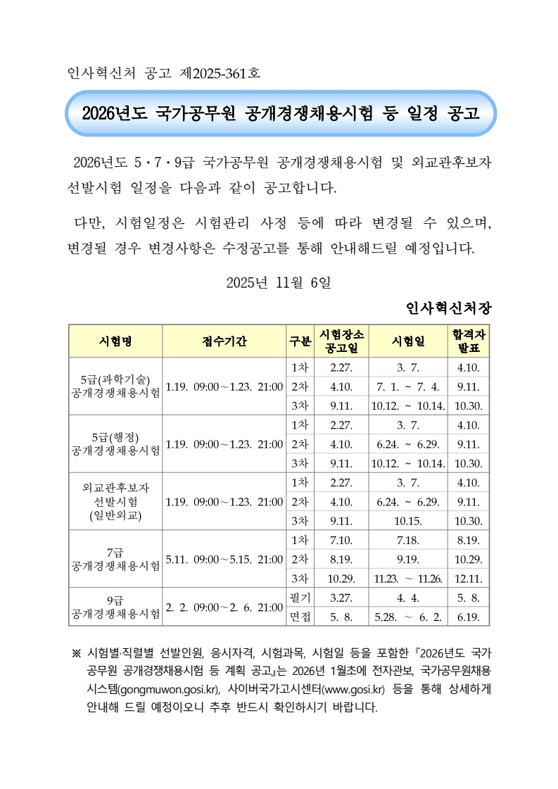 fnctId=bbs,fnctNo=934 글번호 363979 2026년도 국가공무원 공개경쟁채용 시험 일정 공고 수정일 2026.03.31 작성자 국가시험지원센터 조회수 15 등록일 2026.03.31 첨부파일 첨부파일이(가) 없습니다.
