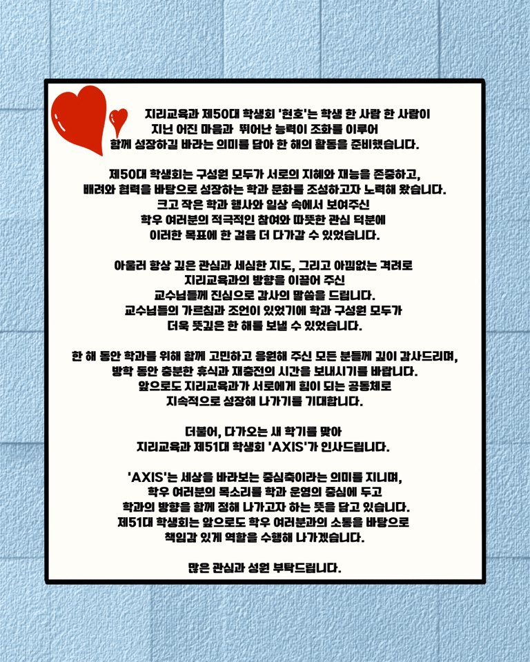 2025학년도 지리교육과 제50대 학생회 활동 마무리 인사 및 제51대 학생회 출범 안내