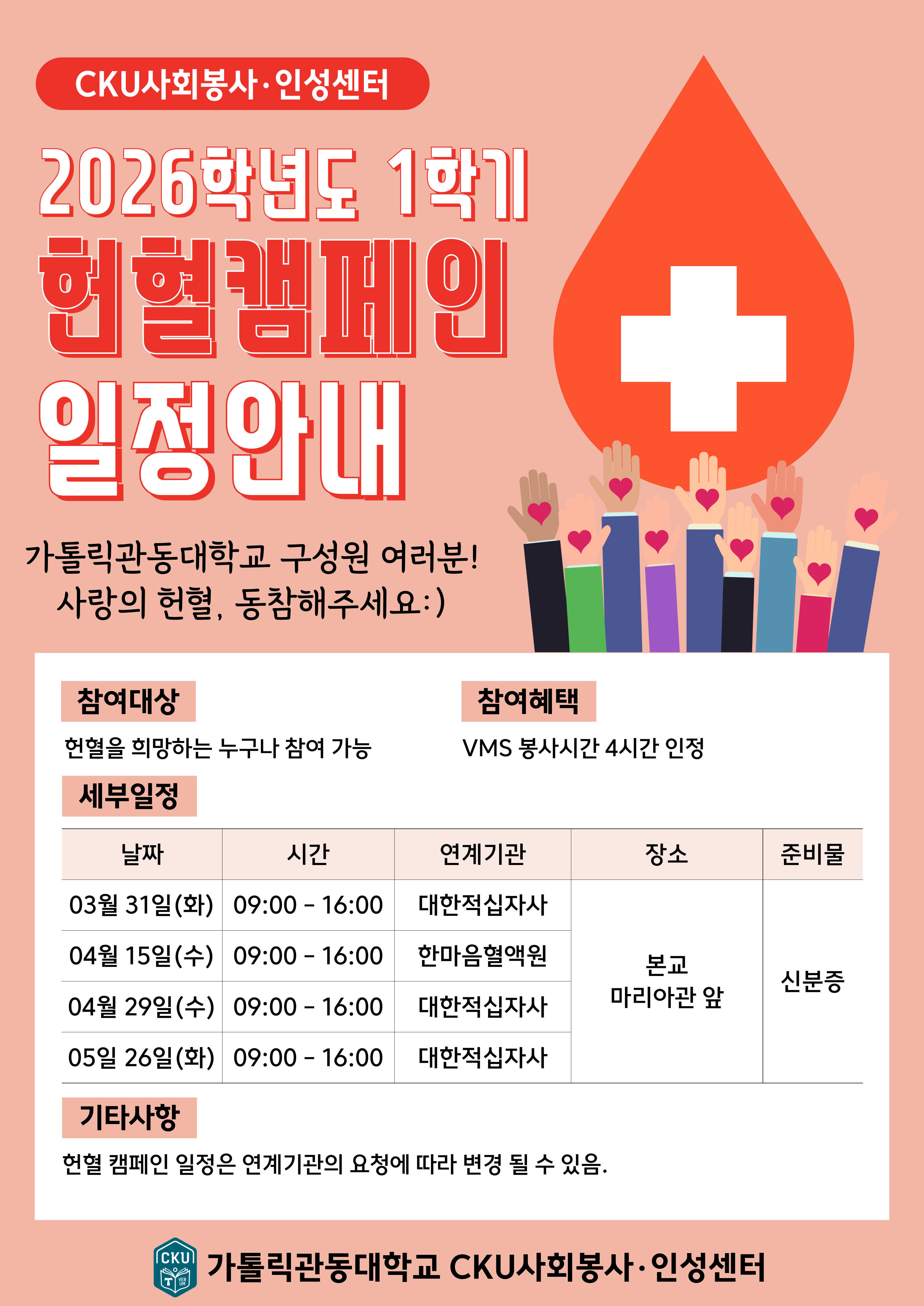 fnctId=bbs,fnctNo=909 글번호 363294 2026학년도 1학기 헌혈캠페인 일정 안내 수정일 2026.02.27 작성자 사회봉사인성센터 조회수 95 등록일 2026.02.27 첨부파일 첨부파일이(가) 없습니다.